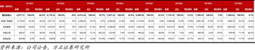 同时19年Q4报表显示,平台订阅用户增长平稳,达 1.07 亿,同比增长22%,月活跃用户数12 月达 5.5 亿且均单日使用时长为 85.4 分钟。会员服务业务收入38.61亿元,同比增长20.6%,营收占比 51.5%。