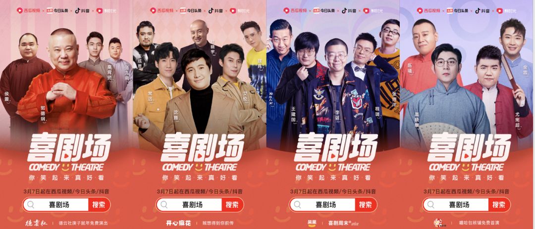据了解从3月7日起,字节跳动旗下的三名大将西瓜视频、今日头条、抖音将共同联合德云社、开心麻花、笑果脱口秀、嘻哈包袱铺四家国内喜剧厂牌推出线上“喜剧场”。郭德纲、沈腾、李诞、高晓攀将分别携各自团队带来新作品的线上首演。此次线上“喜剧场”也将采用“直播+点播”的呈现形式。
