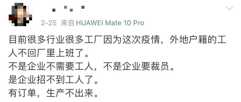 珠三角一位小工厂老板在社交平台上坦言,“眼下这个时候,绝对不能得罪工人。往长远点想,一旦疫情结束,企业纷纷复工,工人最难招,各个厂子几乎是在抢工人。”这位老板的忧心不无道理,“往年开年,就有不少小厂因为工人不到位,导致订单无法完成。”