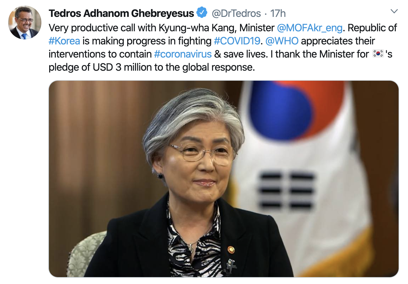 世卫组织总干事谭德塞8日也发布推文称,韩国抗击新冠肺炎疫情取得进展,并对韩方承诺将捐300万美元助力全球抗击疫情表示感谢。