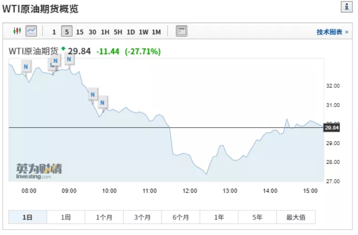 截至发稿,WTI原油最低跌至27.38美元/桶,布伦特最低达31.02美元/桶,日跌幅均从最大30%左右开始收窄。