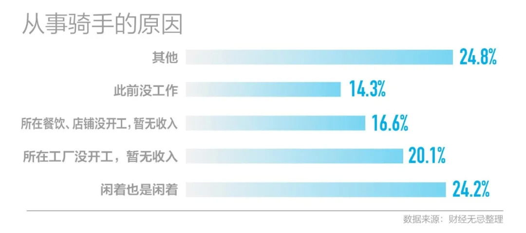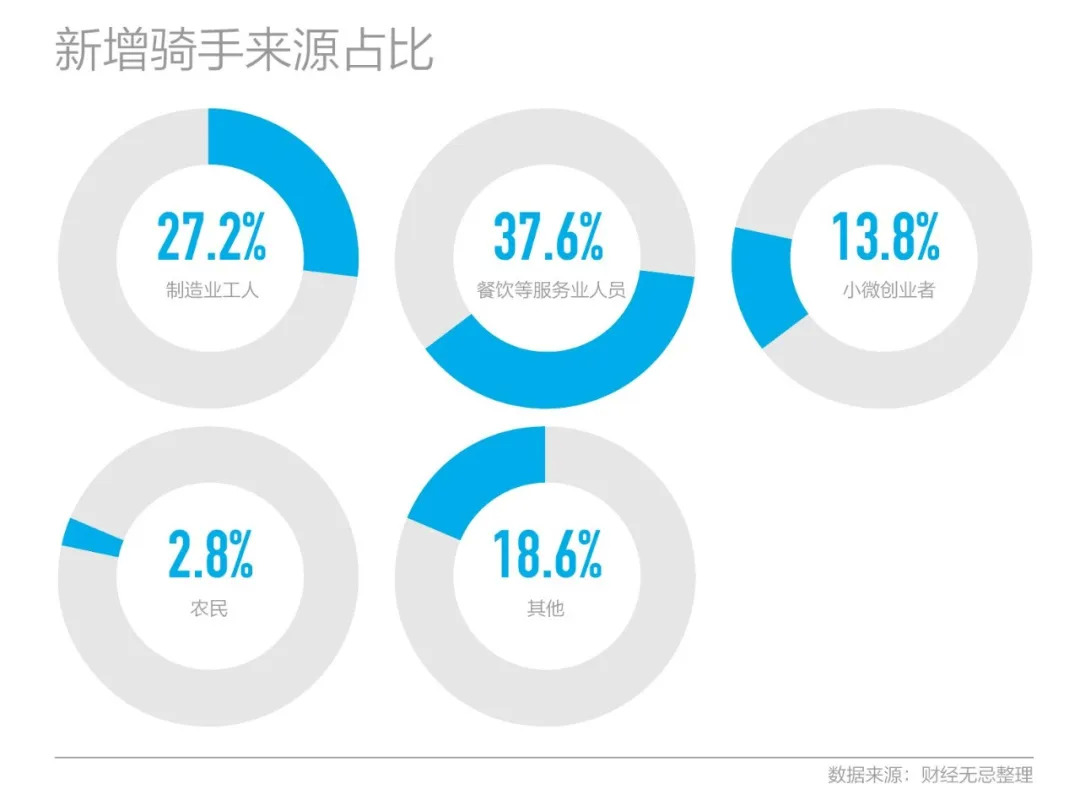 美团发布数据,自2020年1月20日至2月23日,美团外卖配送平台新招聘7.5万名劳动力成为外卖骑手。就像受疫情影响而入行的张琦、贾鹏飞和高鹏一样,这些新增骑手中37.6%来自餐饮等生活服务业,27.2%来自制造业企业,13.8%来自小微创业者。