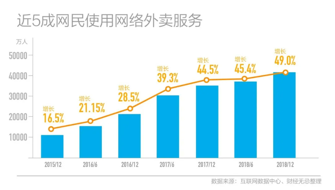 据DCCI发布的《网络外卖服务市场发展研究报告(2019Q1)》统计,从2015年到2018年,网络外卖用户规模增长了2.9亿人,达到3.6亿人,网络外卖服务在网民中的使用率高达49.0%。