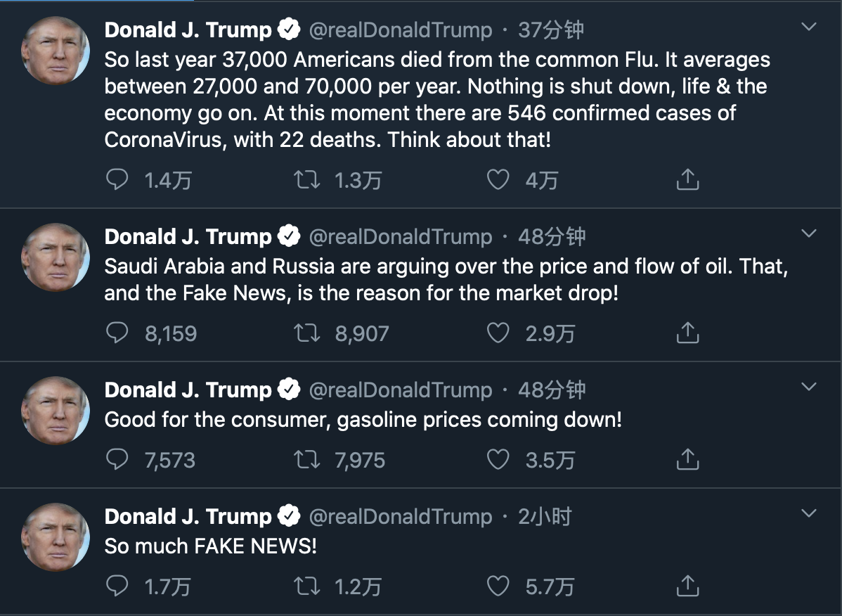 美国股市陷入“黑色星期一”,总统特朗普发布四条推文写道,沙特与俄罗斯就石油价格和产量进行争论,以及政治假新闻,都是令当天股市大跌的原因,且汽油价格下跌对普通消费者来说也是好事。