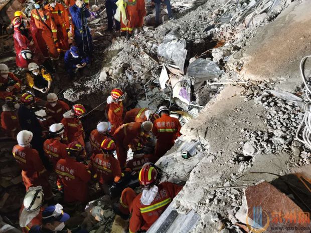 3月7日19时17分,泉州市消防救援支队指挥中心接到报警后,全支队快速反应,19时33分第一批救援力量到场。随后动员全支队力量赶赴现场。省消防救援总队及时启动跨区域增援,全面开展救援行动。在应急管理部、省市各级领导的亲自指挥下,截至3月9日20:00,现场已救出52人,其中生还者41人。