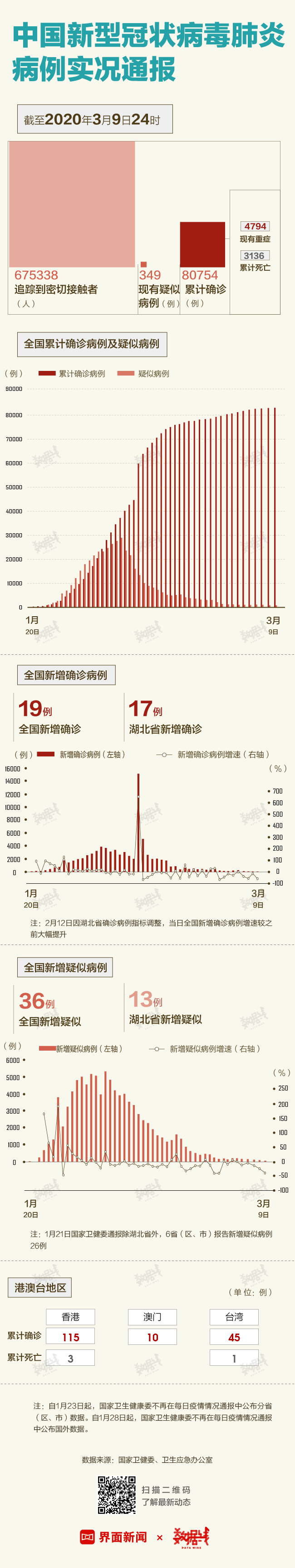 据国家卫健委数据,截至3月9日24时,据31个省(自治区、直辖市)和新疆生产建设兵团报告,累计报告确诊病例80754例,现有疑似病例349例。3月9日0—24时,新增报告境外输入确诊病例2例(北京1例,广东1例)。湖北新增确诊病例17例(武汉17例),新增疑似病例13例(武汉12例)。