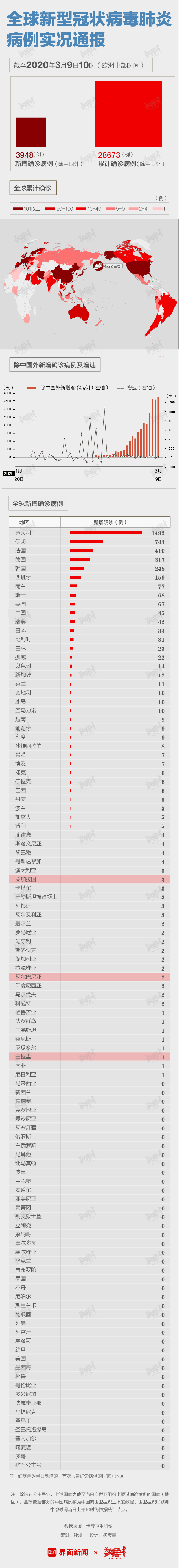 除中国外,全球104个国家及地区累计报告确诊病例28673例,新增确诊3948例,累计死亡686例。