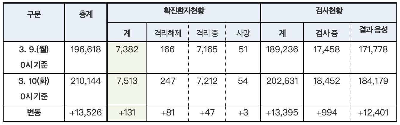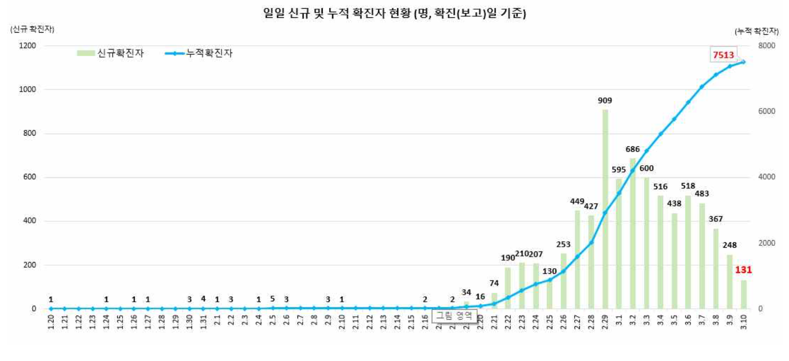 韩国中央防疫对策本部3月10日通报,截至当天零时,韩国较昨日零时新增131例新冠病毒感染病例,较昨日下午4时新增35例,累计确诊7513例,死亡增至54例,治愈新增81例至247例。