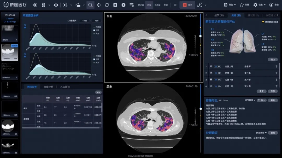 针对医院对新冠肺炎的诊疗决策需求,依图在疫情期间开发了基于CT医学影像的“胸部CT新型冠状病毒肺炎智能评价系统”。