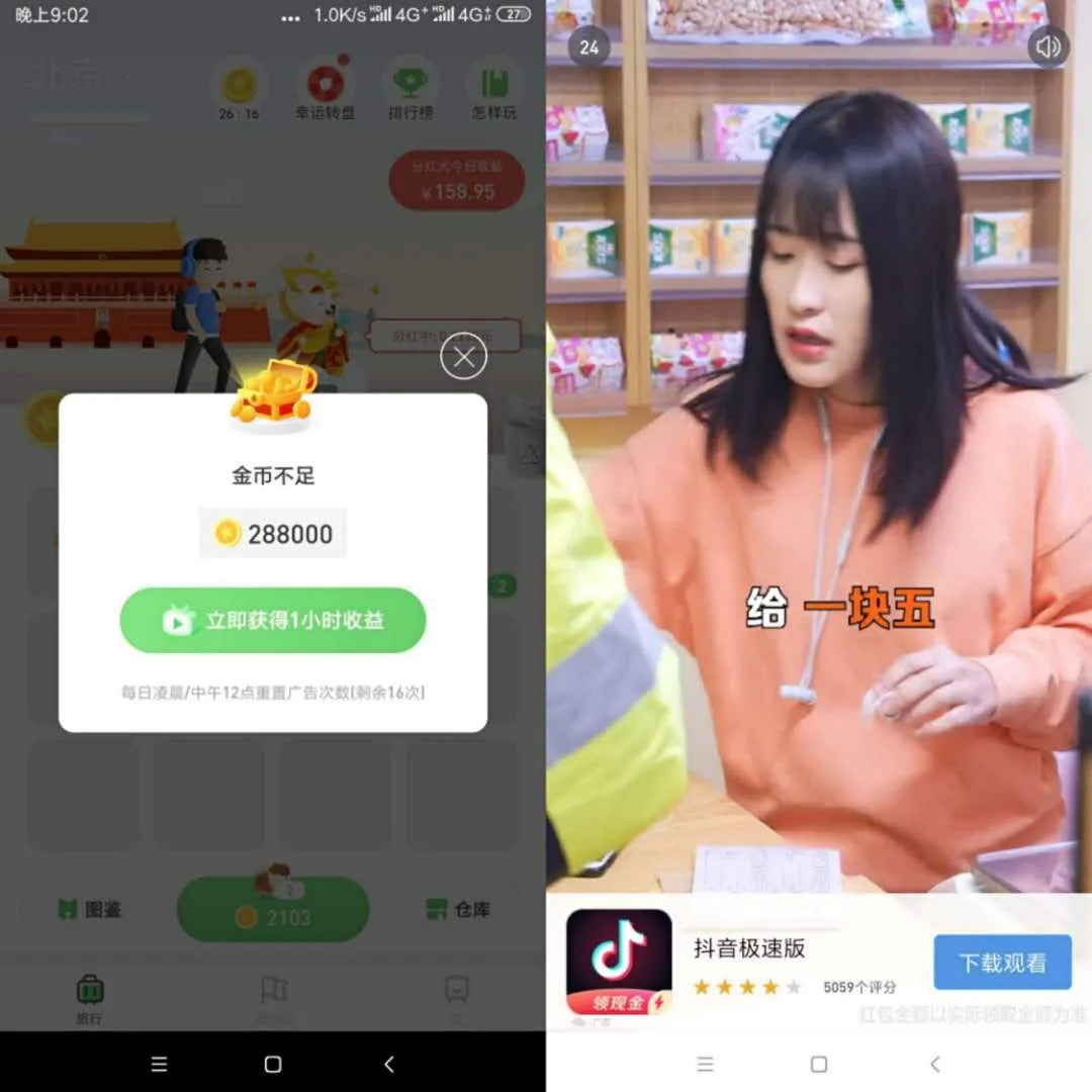 一直买一直合,初始金币很快就会用完,此时会适时弹出让你看广告获得金币的弹窗,广告平均为30S,每天中午12点前可以看15次广告,12点后可以看15次广告,每天看30次也就15分钟,时常刚好控制在大部分人的耐心值范围内。