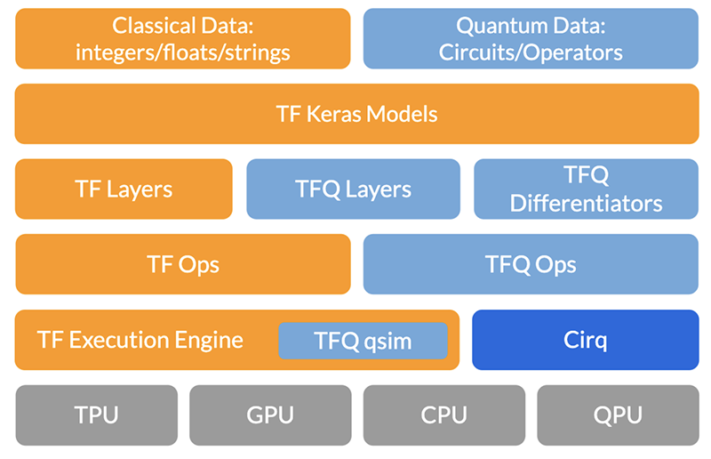 顶层为要处理的量子数据,经典数据由TensorFlow本地处理,TFQ增加了处理量子数据(由量子电路和量子算子组成)的能力。