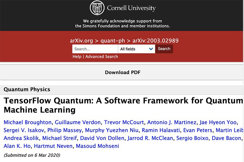 TFQ白皮书《TensorFlow Quantum:用于量子机器学习的软件框架》已在3月6日提交给预印本平台arXiv。论文作者有20多位,分别来自谷歌最神秘的部门Google X、滑铁卢大学量子计算研究所、NASA的Quantum AI Lab、大众汽车和Google Research。