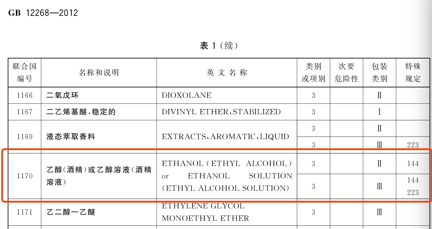 此外,按照GB12268规定,按体积乙醇含量不超过24%的水溶液,不按照危险品运输;如果在试验时,酒精(乙醇)溶液的化学或物理性特质不符合危险货物品名表的类别或相别的定义标准,也不作为危险品运输。