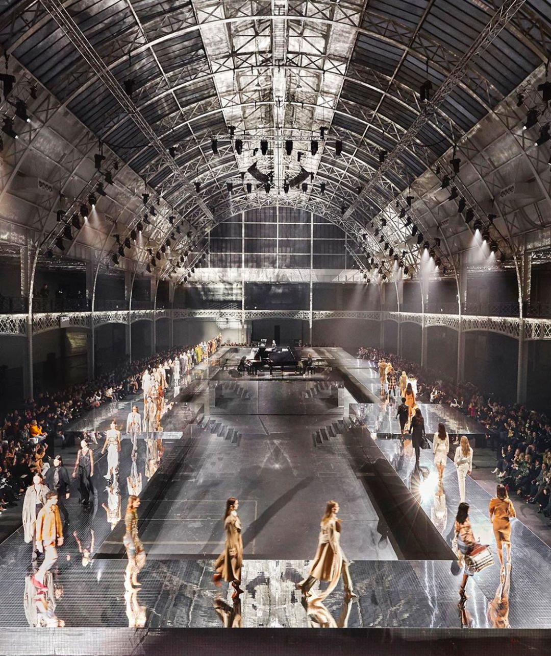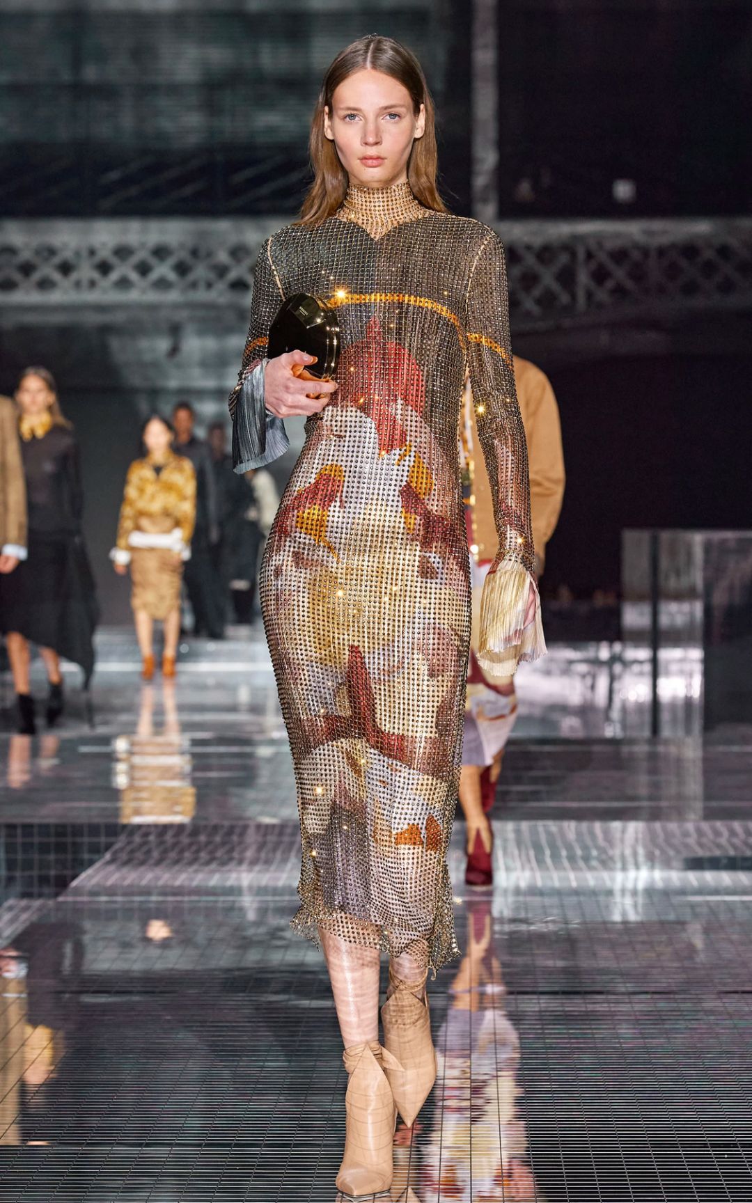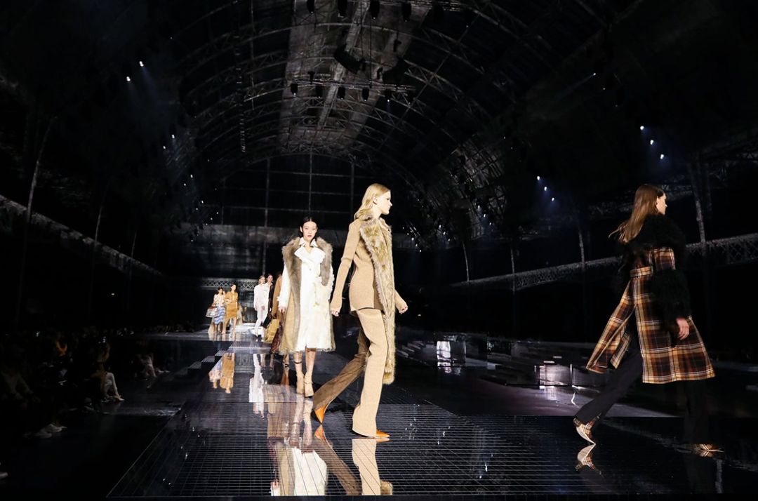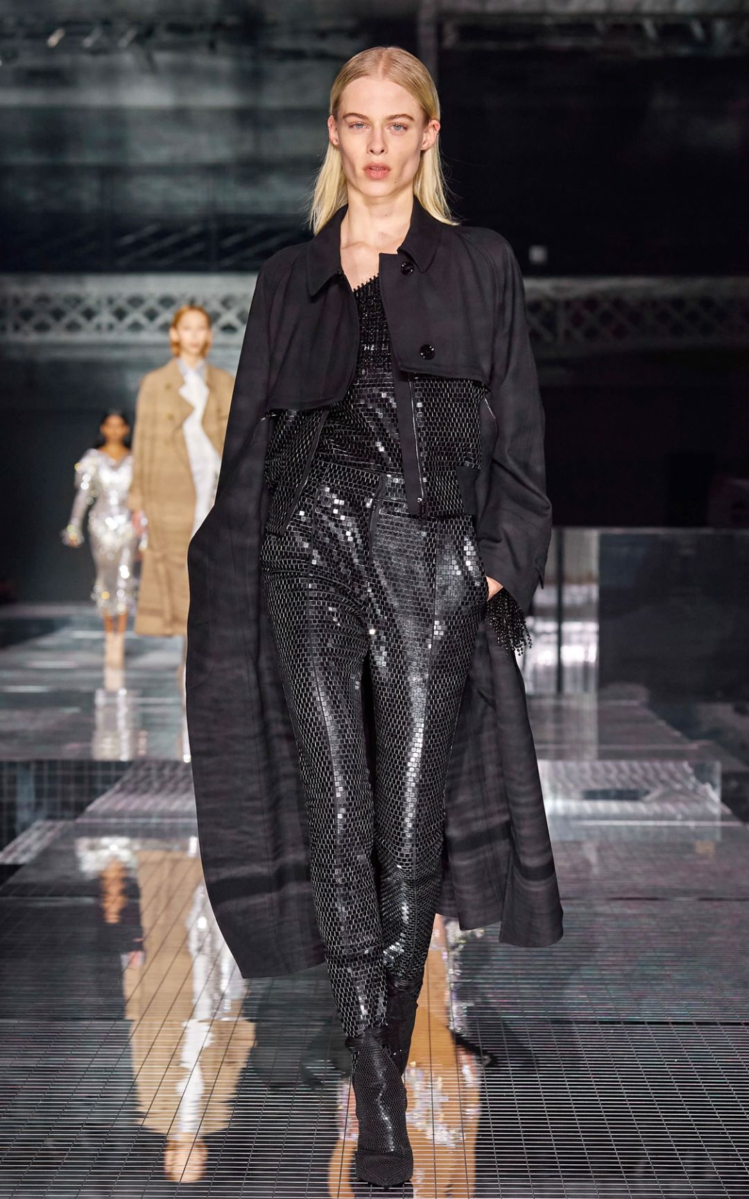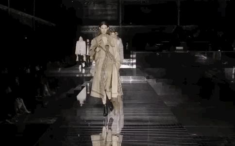 根据主题,Burberry搞了个巨大的镜面回廊,波光粼粼的光影从镜子倒影在模特身上,衣服看起来就像打上了一层流动的滤镜,有种虚幻透向现实的感觉,好美……