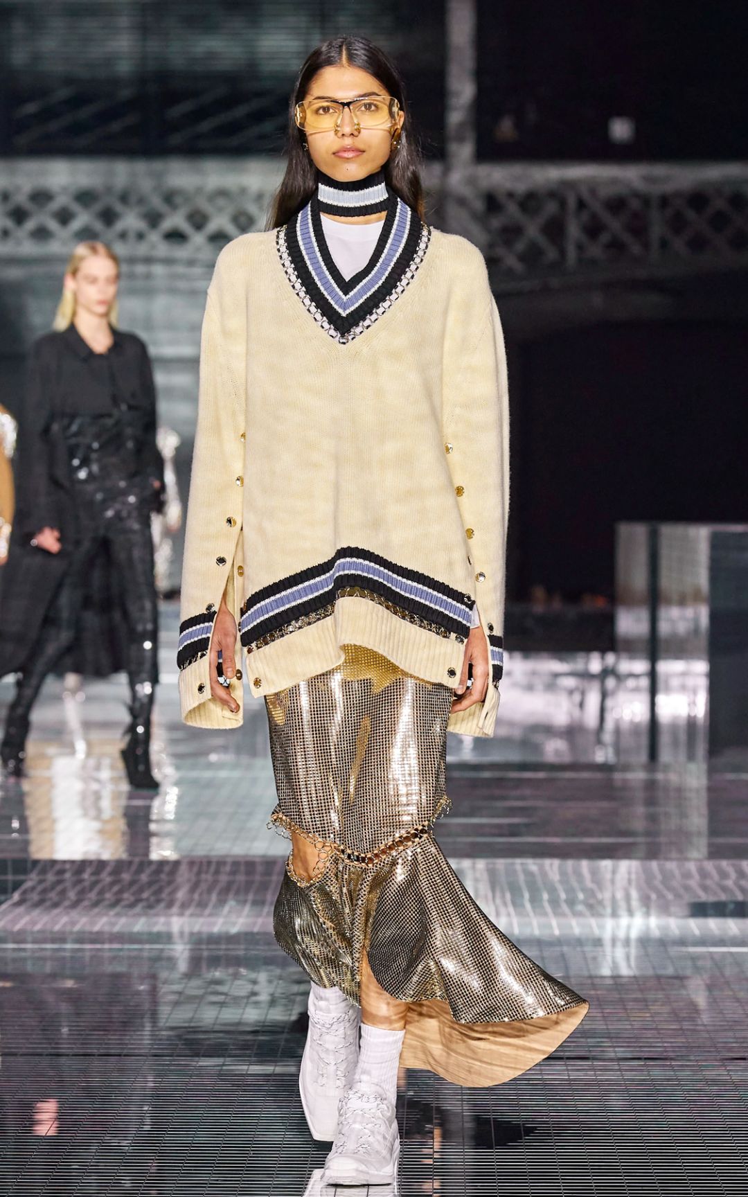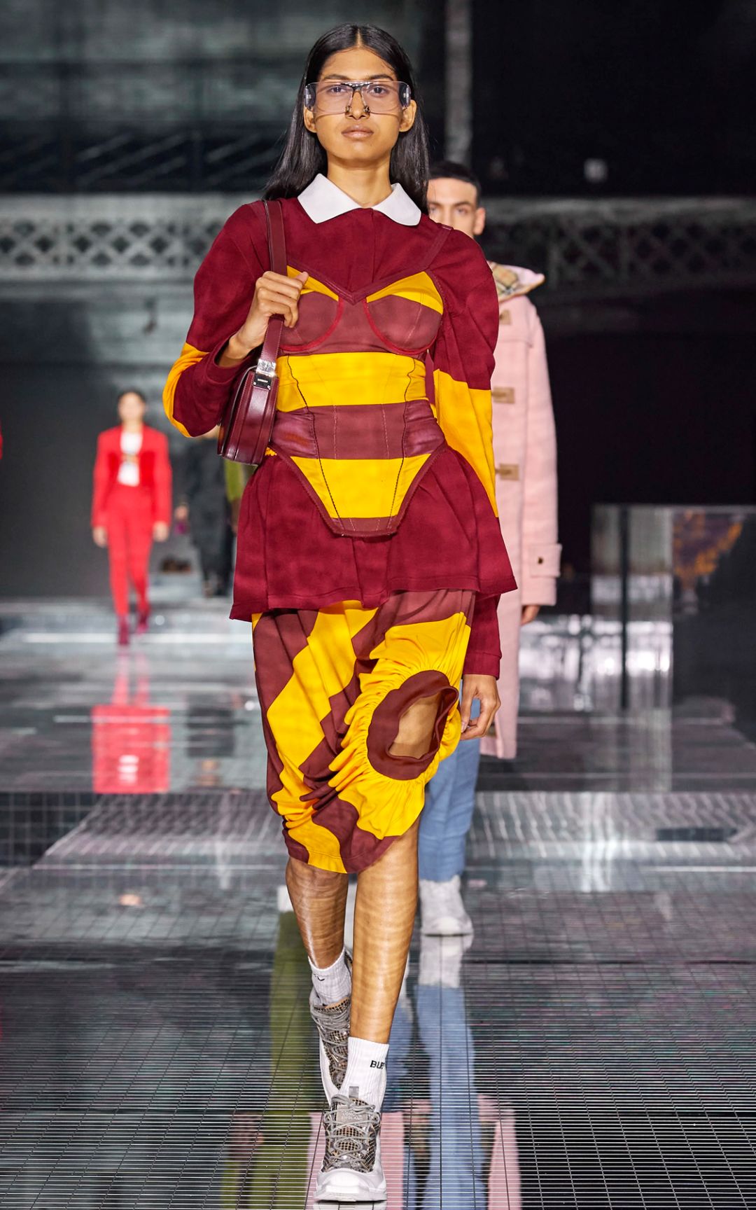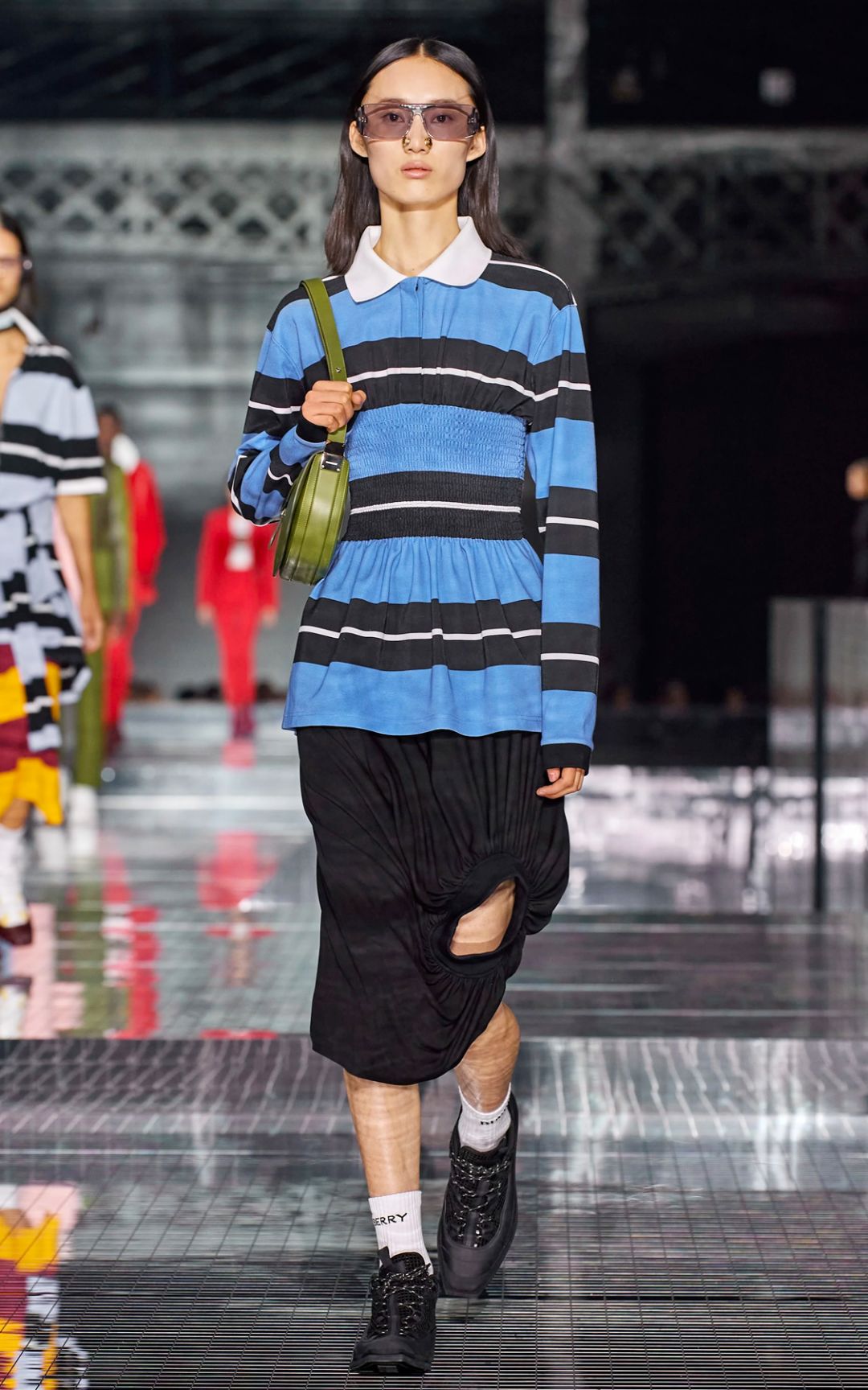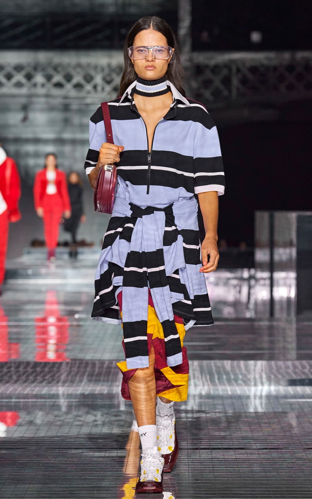 还有这套也很妙,把灵魂的条纹拆解出来做成胸衣。裙子也像是拿了一条橄榄球衫裹了起来,还能看到松垮的领口。