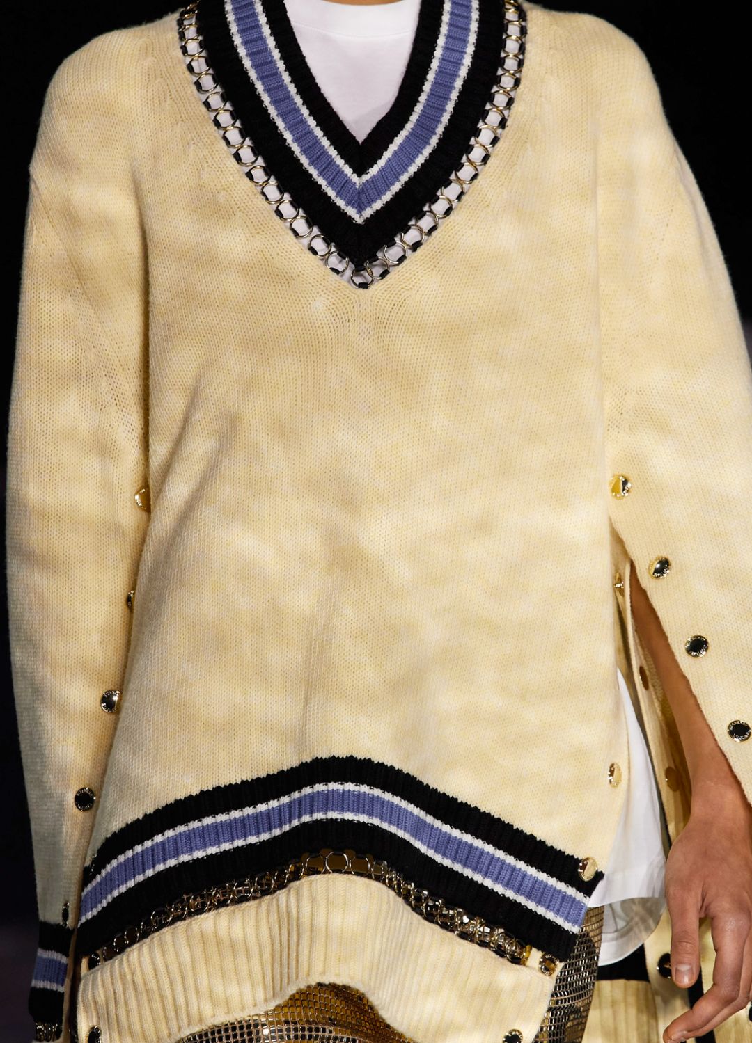 毛衣上镶着金属链条,解开金属纽扣后袖子就变得和斗篷一样潇洒。