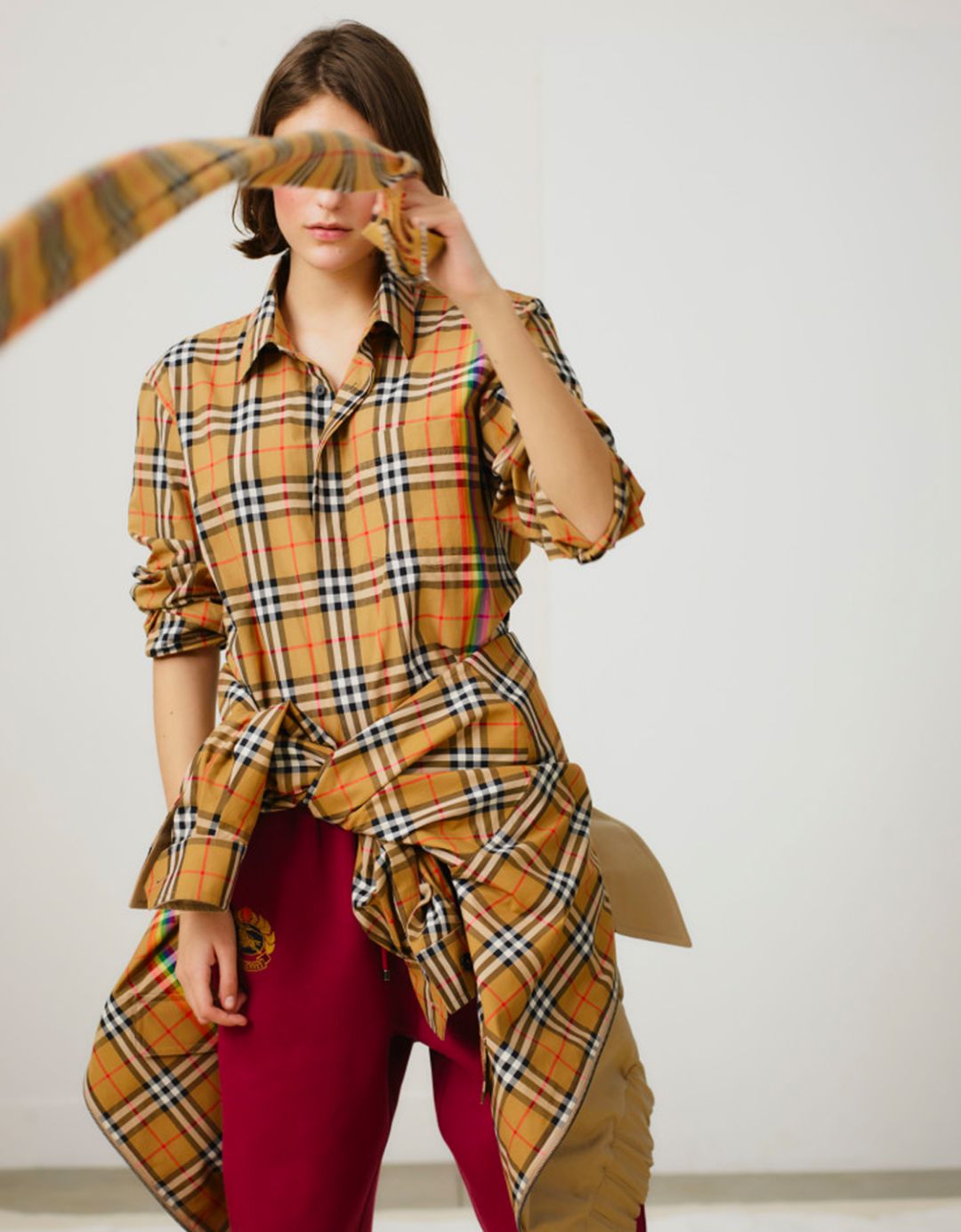 但是Riccardo用街头风的粗暴拼接手法,把它和Burberry最经典的三粗一细交叉格纹,做在一起。