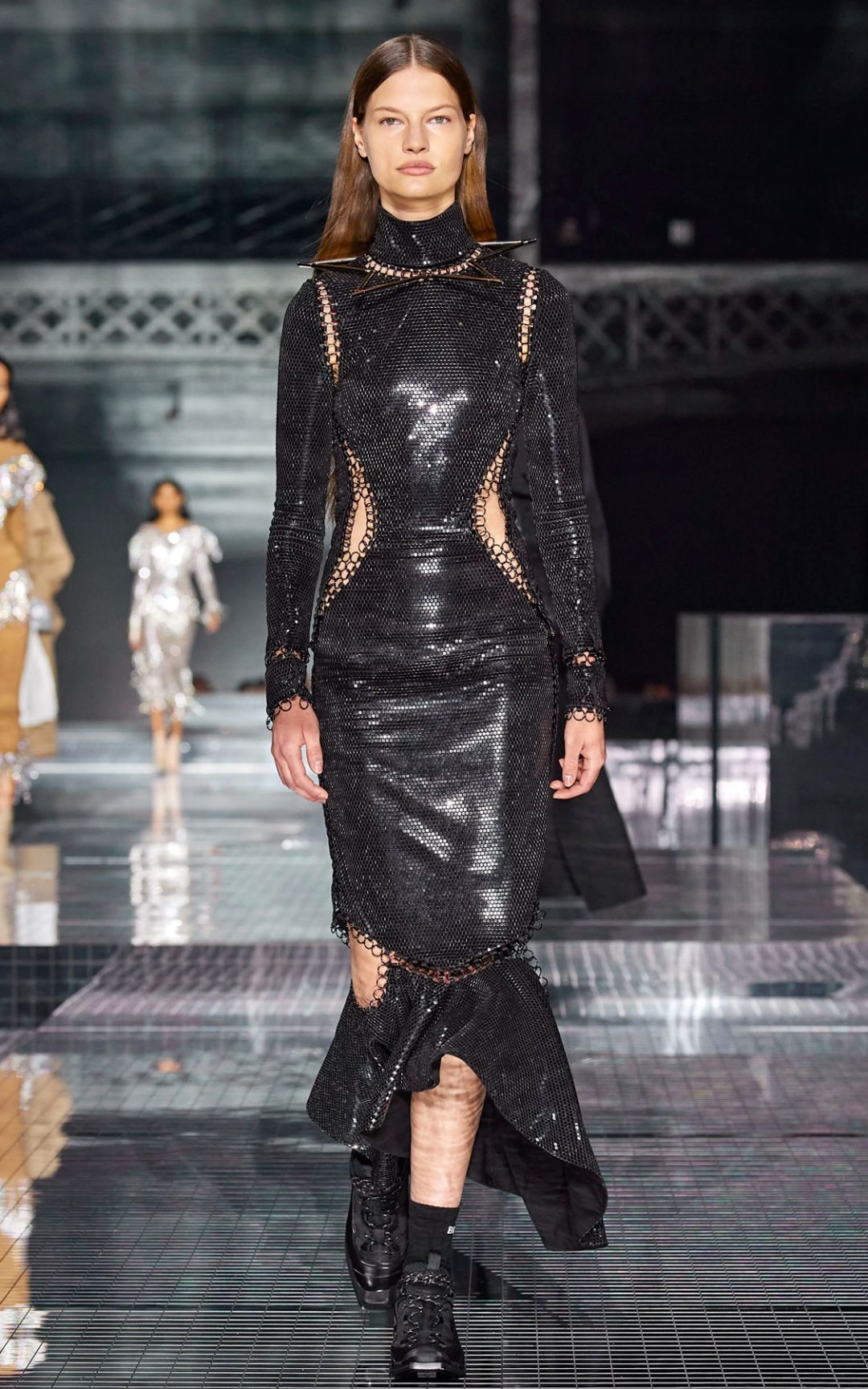 长裙也被拆解成几片布料,用密密麻麻的圆环连接,多了几分摇滚味和性感,走起路来裙摆也摆得更嚣张了。