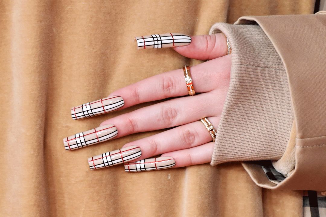 但宇博的关注点,不在这里。而是她穿了一整身Burberry,就连美甲……