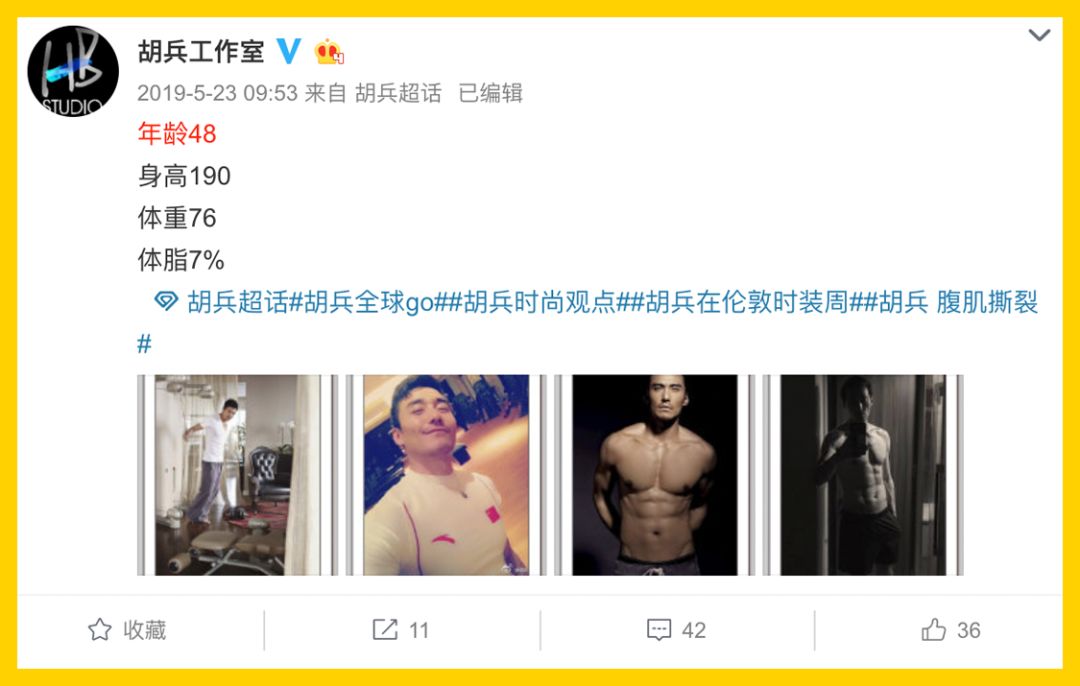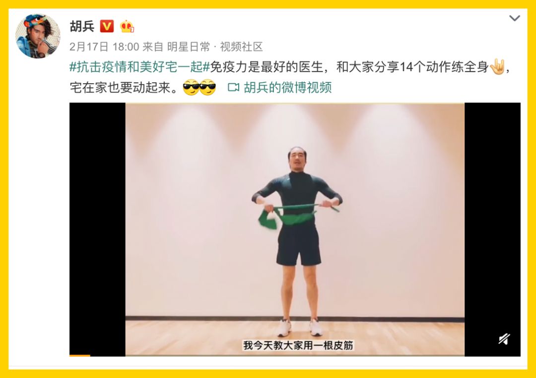 翻一下他的微博,都是“和大家分享一下在家也能练全身的动作”、“当我无聊的时候我在健身”、“疫情期间8个瑜伽动作保持身材”…… 身材比小鲜肉还好。