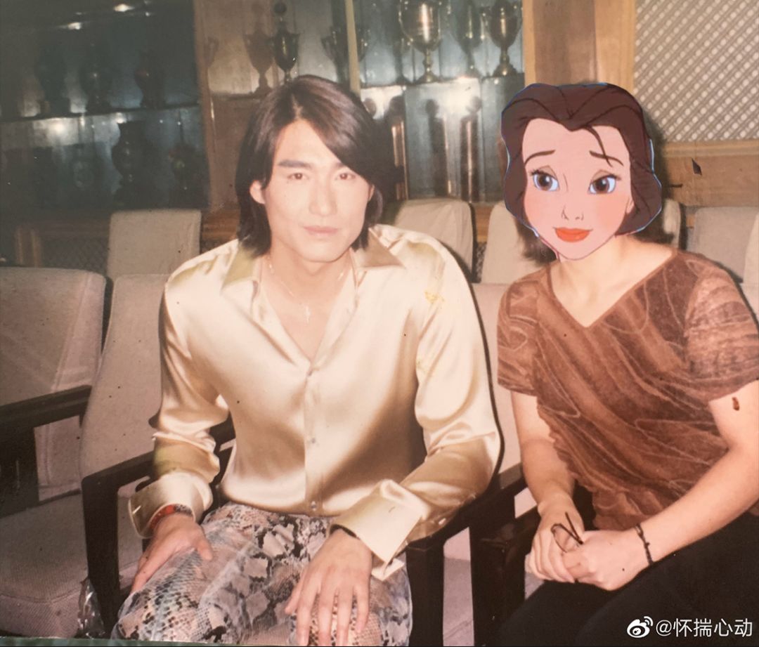 而且觉得和别人不一样啊,穿得衣服都很时髦的。我在网上还看到有网友po他妈妈和胡兵年轻时候的合照,这贵妇缎面衬衫和蟒蛇纹裤子,是真的骚气厉害……