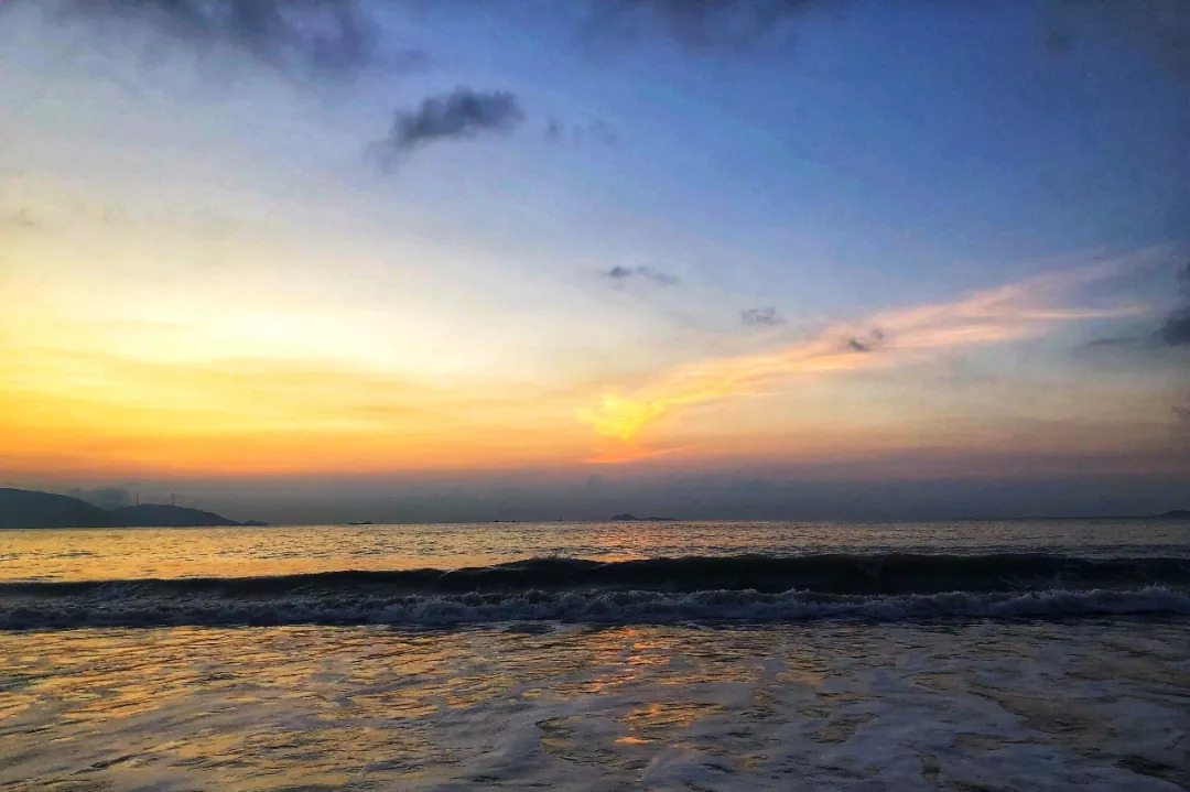 天边泛起微醺的红晕,海面上明晃晃跳跃着小精灵,色彩斑斓。