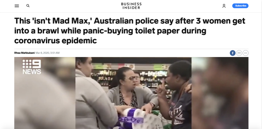 在澳大利亚的社交媒体上,#toiletpapercrisis(厕纸危机)话题成为热门;近期最红的一条视频,是关于三位阿姨在超市里为抢夺厕纸大打出手。