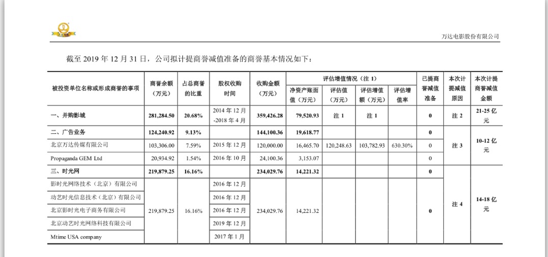 从万达电影发布的计提商誉减值准备的商誉基本情况来看,并购影城带来的商誉达到28.13亿元,占万达电影总商誉比重达到20.68%,本次该部分计提商誉减值金额为21-25亿元,占此次计提商誉减值近半。
