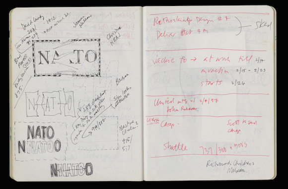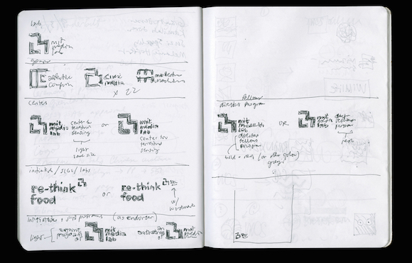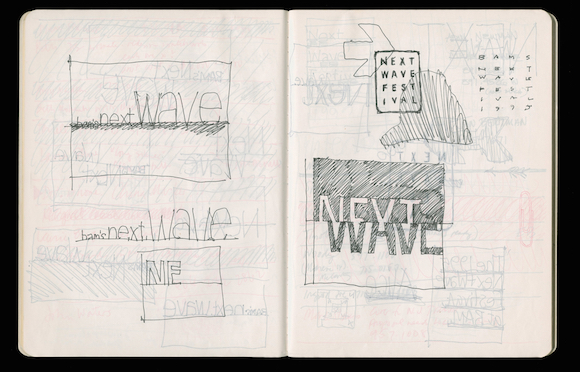 另一页笔记则展示了布鲁克林音乐学院的试验 Next Wave 音乐节背后的设计过程。“其中之一是放置在地平线上的非常简单的‘Next Wave’,用了不同大小的非衬线字体,看上去它们仿佛从你视野的各个方向涌来。”Bierut 说。约 20 年过去了,尽管经历了小修小补,这个设计仍是音乐节 logo 的基础。同样,近半个世纪的职业生涯过去了,毫无疑问的是 Bierut 的设计作品在今后的几十年中将会无处不在。