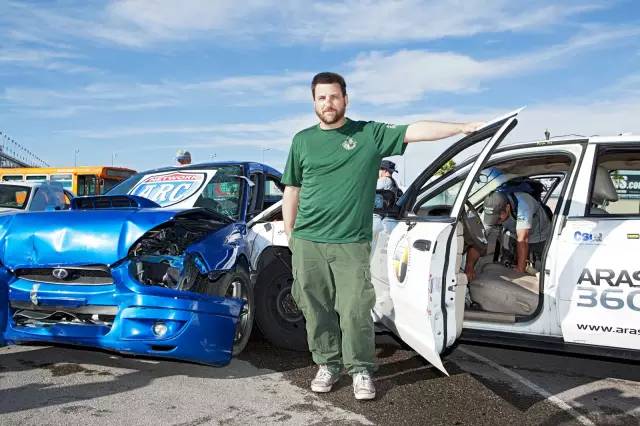 总体上看,我还算安然无恙。其实这样的结局没有我想象中那么壮观。和其他撞车事故没什么两样。当然,我必须承认,这次碰撞是由专业驾驶者操作、在封闭环境内、所有环节均完美受控的状态下完成的。有一点我猜对了:我们的车速超过了40英里/小时一点点。WRX的A柱上的传感器测到撞击瞬间的加速度超过了100g。