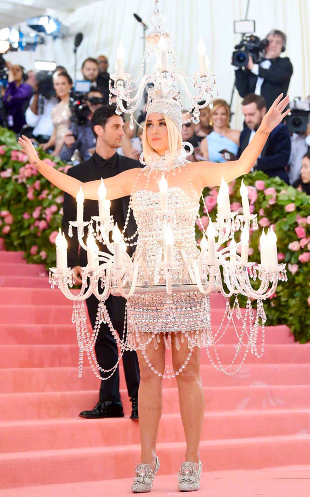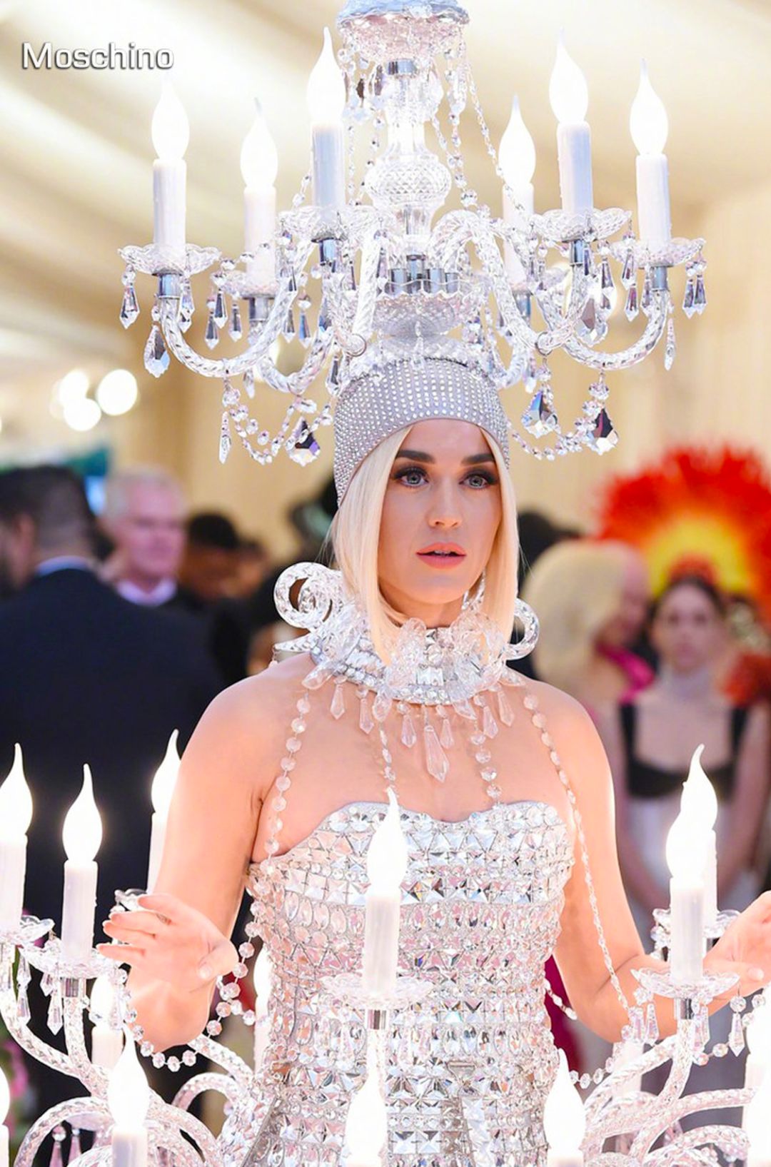 比如,去年Met Gala,她当万圣节在过。直接把自己变成了一盏MOSCHINO水晶吊灯,灯灯灯灯,déng、dēng、děng、dēng~