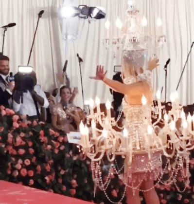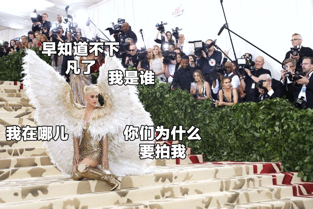是真正的燃烧自己,照亮别人。有记者问她,该怎么坐下啊,她翻了个白眼,说在Met Gala不用坐下,就飘走了。还唱了Sia的Chandelier(吊灯)……