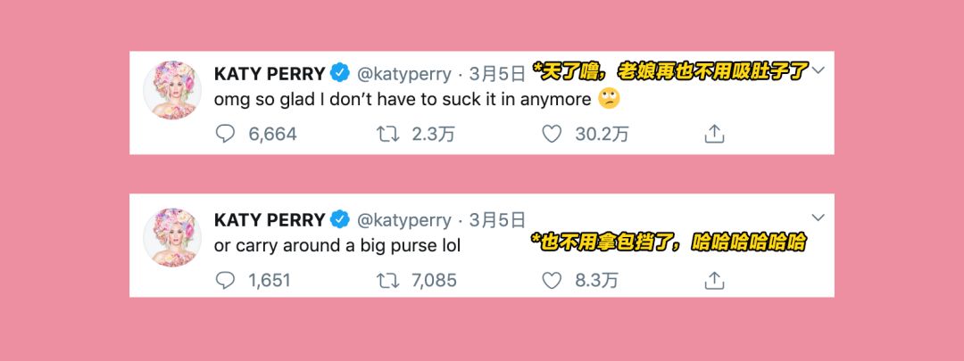 之后她还发Twitter很开心地嚷嚷:太好了!终于不用吸肚子或者用包包遮着了!