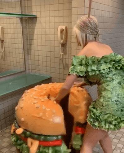 还展示了一番生菜如何钻进汉堡里,令路过的Jlo也满脸???