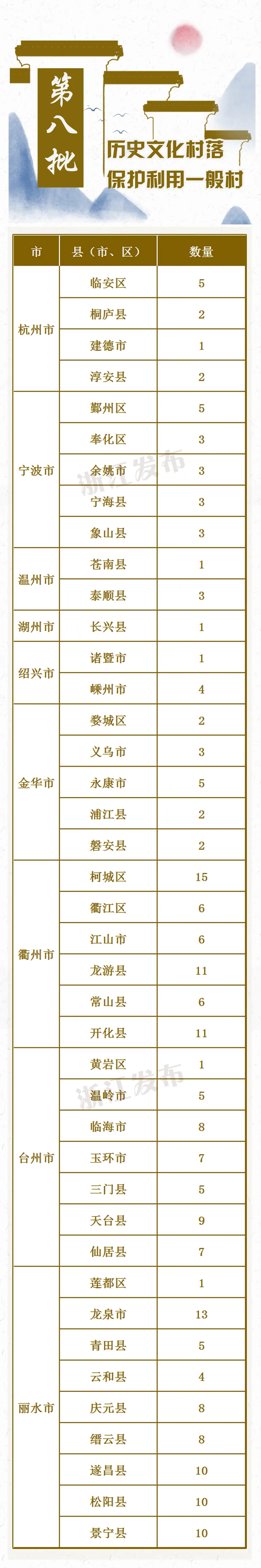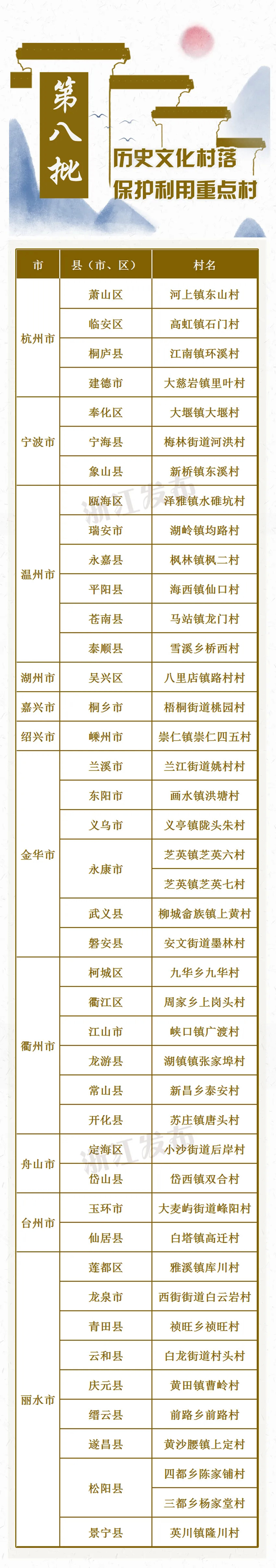 按照省委办公厅、省政府办公厅《关于加强历史文化村落保护利用的若干意见》 和建设新时代美丽乡村的工作要求,2020年浙江启动实施第八批历史文化(传统)村落保护利用重点村43个、一般村217个。