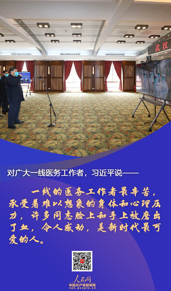 ● 全国人民都在关心关注着你们。医务人员要竭尽所能为大家提供治疗,各方面要关心被感染的群众,照顾好他们的家人,让患者安心接受治疗。