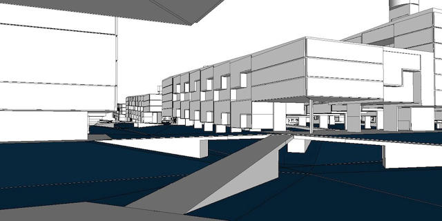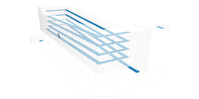 Fleming以悉尼为例,思考如何在城市中修建自行车道网络。他设计了一座位于市中心的公寓,公寓每一层都有坡道,人们可以坐电梯将自行车带到楼上,再从坡道上骑下来,一直连接到公寓外的自行车道。简单来说,这样的自行车道网络不仅局限于露天道路,还延伸到了建筑中。