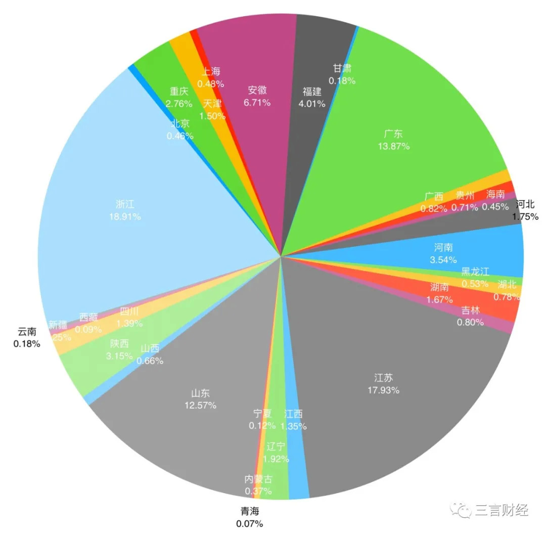 从饼状图可以看出,这些企业所在地区中,占比较高的省份为江苏、广东、浙江和山东,四个省份总共占63.28%。