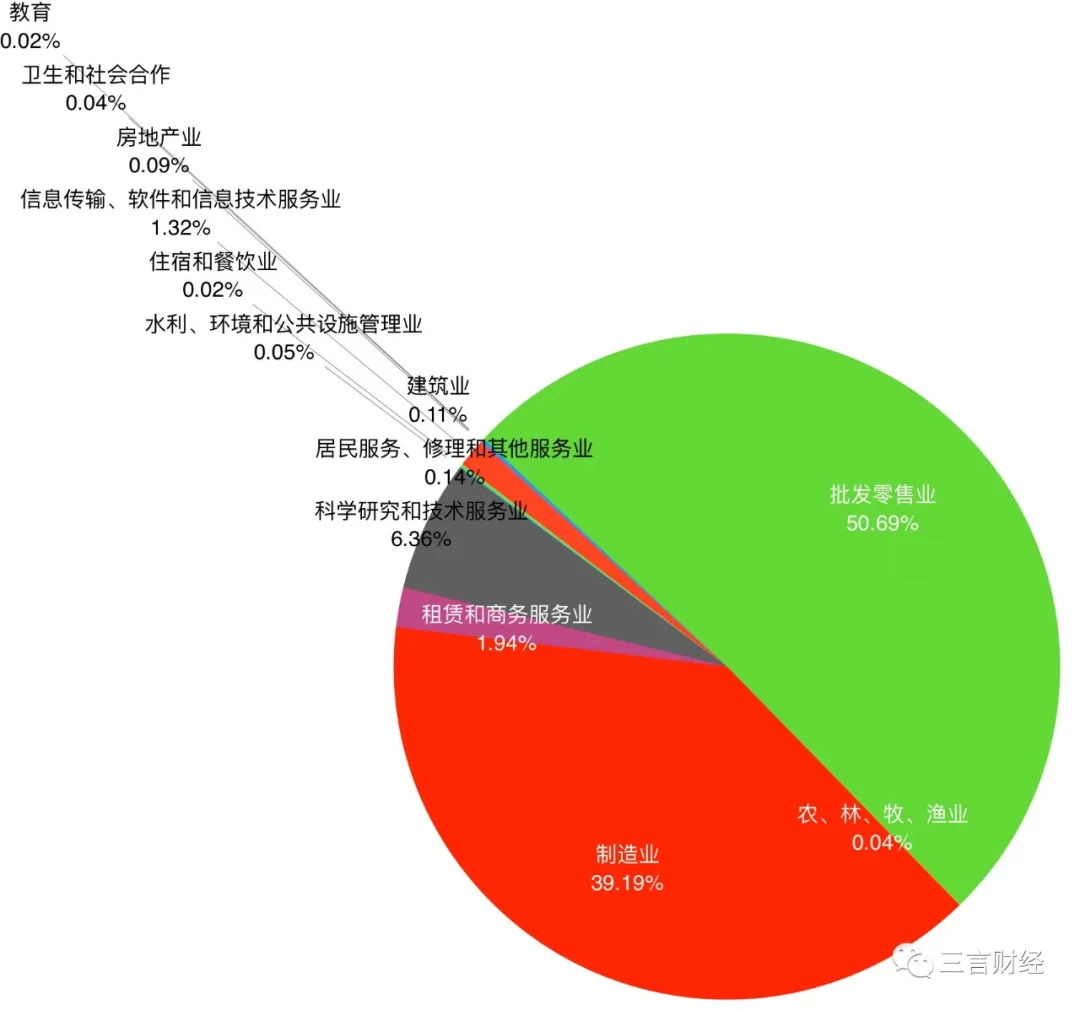 若根据生产制造口罩的企业所在行业看,大部分企业集中在批发零售业和制造业,占比分别为50.69%和39.19%;其次为科学研究和技术服务业,占比6.38%。