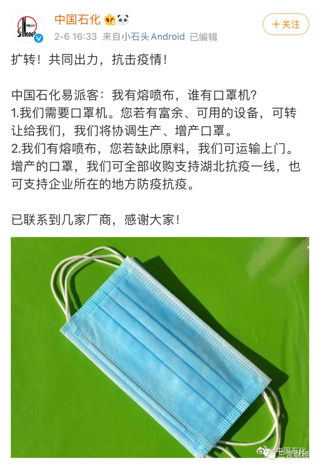 2月初,中石化的这句话让其成为“网红央企”。中石化宣布开始生产口罩原材料熔喷布的消息也为口罩产业链打入一记强心针。