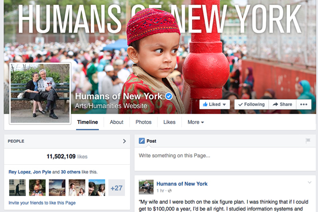 反正在2010年11月,突然开窍的Stanton在Facebook上建了“人在纽约”的页面,他赶紧把自己拍的照片在那上传分享。最初每天新增一两个粉丝,Stanton已经很开心了,没想到后来雪球越滚越大,这涨速几乎都失控了。