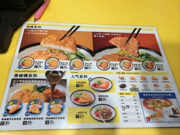 从菜单上看,这家店主打的是各种排——鱼排、鸡排、猪排饭,分为油炸和卤汁两种,另外也有牛肉饭等单品。一顿饭20~30元就能解决,价位和麦当劳德克士差不多。另外现在还在促销活动,买套餐送一份甜品。这个送的布蕾跟德克士里味道一样。