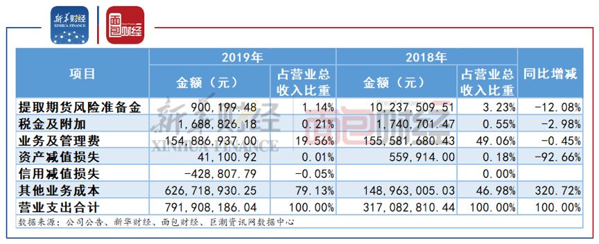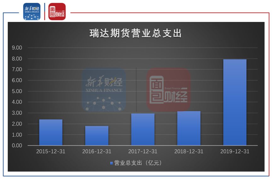 财报显示,瑞达期货营收大幅增长的同时,成本也显著增加。2019年,其营业总支出达7.92亿元,同比增加149.75%。