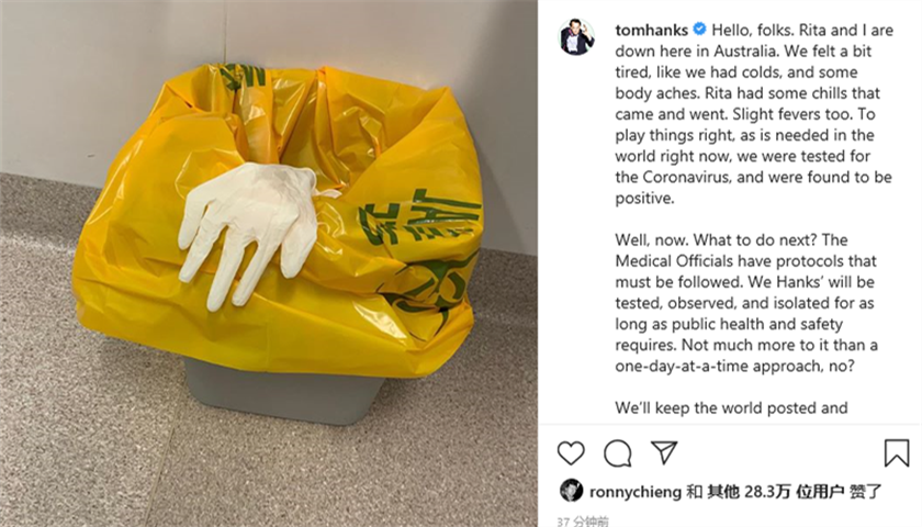 3月12日,曾扮演阿甘的美国影星汤姆·汉克斯(Tom Hanks)吃下了一块让影迷们心跳加速的巧克力。他在社交媒体Instagram发文称,自己和妻子丽塔·威尔逊(Rita Wilson)在澳大利亚黄金海岸接受检测时双双被确诊感染新冠病毒。