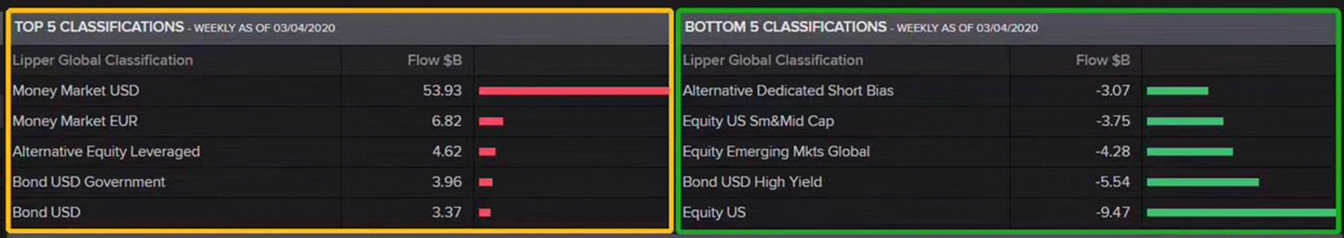 而且在目前全球市场受疫情影响剧烈动荡的大背景下,配置货币类资产也十分符合当下全球市场的资金流向趋势,从下图中可以看出,全球资金流入最多的资产类别正是货币市场,而股市及高收益债则出现了大幅度的资金流出: