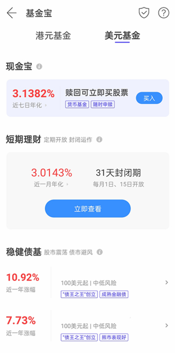 而且部分优质的货币基金还可以在各类资产普遍下滑的情况下保持不俗的收益。富途联合高腾、大成等几大基金公司,推出富途现金宝,四大货基产品涵盖港美元资产,全场基金0佣买卖,还可立即赎回购买股票,既能保证流动性,又可拥有理财收益,助力投资者把握市场机会。