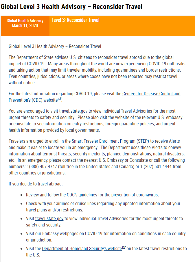 鉴于新冠肺炎疫情的持续传播,美国国务院在11日将旅行警告上调至第三级,建议所有公民对出国旅行的计划进行重新考虑。