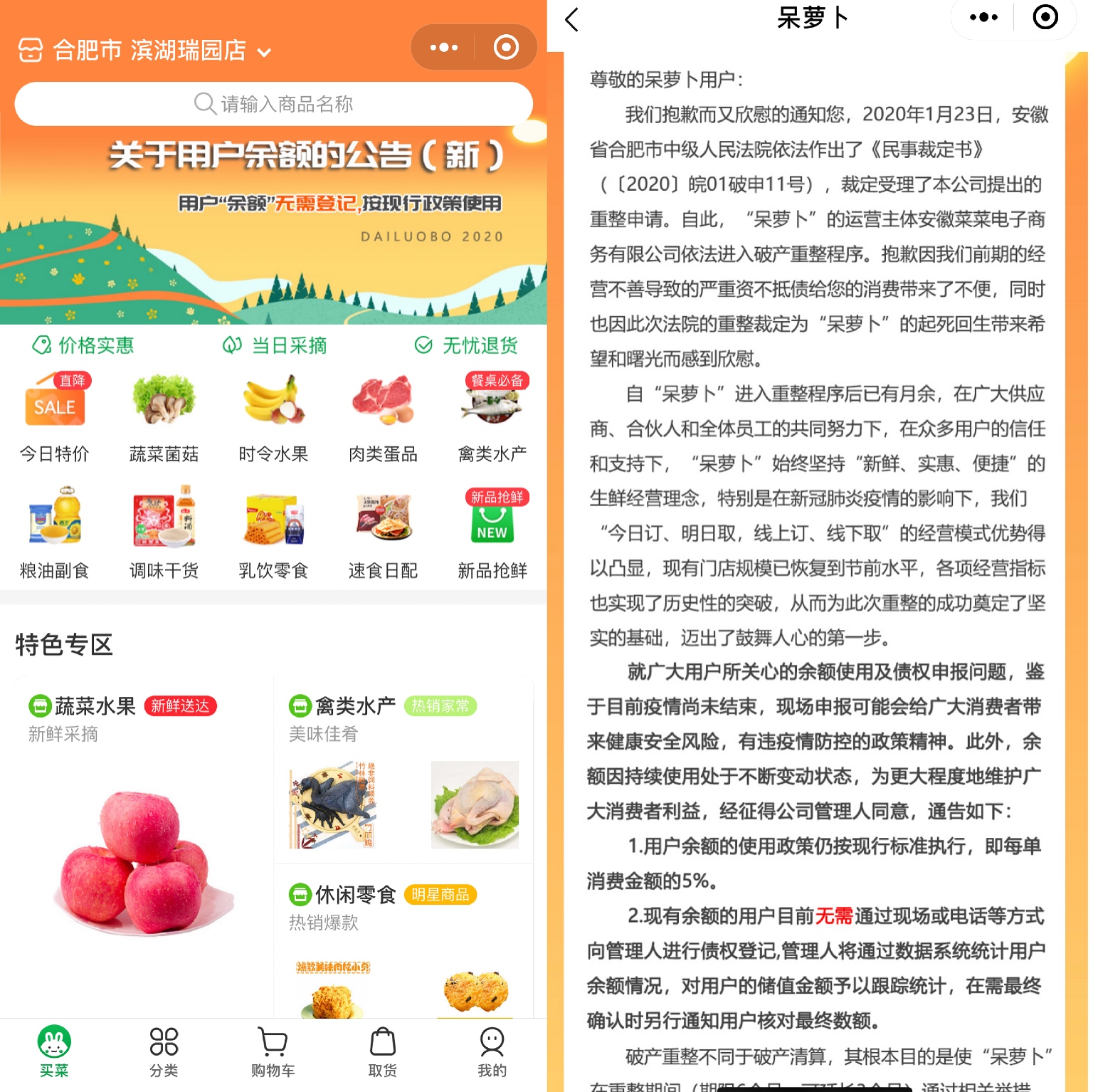 3月11日的一份破产文书披露了呆萝卜目前的窘况——其两家主体公司之一的安徽菜菜电子商务公司正式进入破产重整程序。