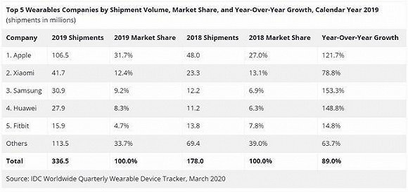 近年来,消费者对各种智能设备需求强劲,而可穿戴设备则在这个大趋势下,市场增长迅猛,尤其在苹果带领下,全球可穿戴设备呈现出蓬勃发展态势,IDC最新数据显示,2019年全球可穿戴设备出货量同比增长89%至3.37亿台。不过,市场主要集中在头部五家厂商手中,分别是苹果、小米、三星、华为和Fitbit,他们占据全球66.3%市场。