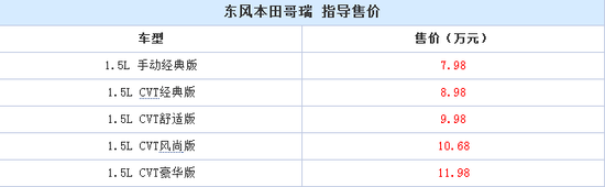 10月16日,东风本田正式公布了旗下全新入门级车型——哥瑞的正式售价,新车共有1种排量5款车型,售价区间为7.98-11.98万,详情见下表: